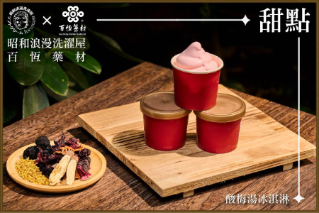 昭和浪漫洗濯屋 ×百恆藥材 【甜點】桂花酸梅冰淇淋 將清潤酸甘、花香淡雅的桂花酸梅湯製作成冰淇淋,將迪化街獨有的漢方氣息,重新詮釋後化為沁涼甜品,酸甜平衡、氣味悠長,彷彿在石板路上漫步。在午後陽光灑落的紅磚騎樓,品味一口,便嚐到迪化街的優雅與從容。 |