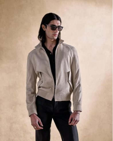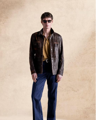 本季回歸對材質與工藝的深刻致敬,揉合匠心工藝與搖滾精神,構築出內斂卻堅定的姿態。皮革與亞麻等面料經由手工反覆處理,呈現如歲月淬鍊般的豐富層次;陽光褪色的色調結合細緻的仿舊工藝,交織出低調而雋永的奢華質感。服裝輪廓游走於鬆弛與精緻之間,展現當代紳士從容不迫態度。麂皮西部外套以俐落剪裁詮釋曠野中挺拔而沉穩的紳士魅力,輕盈丹寧套裝則注入率性與實穿性。同時,細節設計延續品牌一貫的搖滾靈魂——鏈甲綴飾的羊皮皮衣為柔韌皮革間增添反叛個性;復古提花西裝則巧妙嵌入金屬絲線,營造挺拔立體的輪廓感。