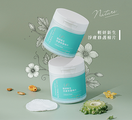 - 《輕妍新生淨膚修護棉片》——玻尿酸搭配山苦瓜萃取與維生素C,清潔、緊緻、亮白一次到位,適合日常修護與外出緊急使用。