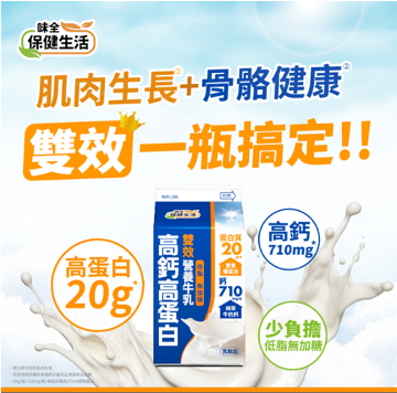為了幫助現代人補充這兩大必要營養素,由專業研發團隊打造推出的全新產品「味全保健生活雙效營養牛乳」,主打高鈣、高蛋白的雙效營養設計,每瓶(375毫升)即含有710毫克鈣質與20克的優質動物蛋白,一瓶就能輕鬆補充[2] ,真正做到一瓶雙效、營養到位。此外,更採用低脂配方設計、無額外添加糖,保留牛乳天然風味與營養、好喝輕負擔。