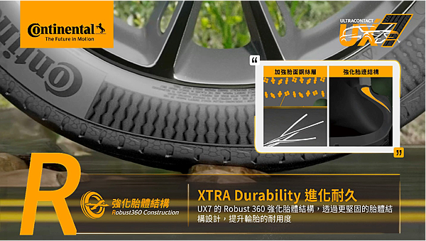 - UltraContact UX7 採用全新 Robust360 強化胎體結構技術,具備以下三項關鍵強化設計: