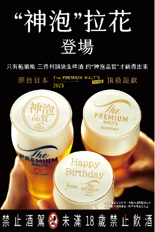 三得利頂級啤酒採用天然水釀造,搭配嚴選鑽石麥芽與歐洲濃香型啤酒花,打造如絲絨般細緻、如牛奶般柔滑的綿密口感,成就極致「神泡」體驗。品牌堅持 7:3 的完美啤酒與泡沫比例,讓綿密滑順的口感於舌尖展開,細膩帶出麥芽醇厚與啤酒花雅致的香氣,這道頂級泡沫不僅是風味的保障,更是視覺與工藝的極致象徵——專業的注酒技術,讓泡沫厚實飽滿、穩定覆蓋,精準描繪出獨一無二的「神泡拉花」,賦予每杯 The PREMIUM MALT’S 專屬感與高級感,更是每一杯頂級啤酒對品味者的專屬獻禮。