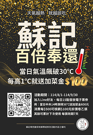 這場「百倍奉還」活動不只是口號,更是史上最瘋狂的折扣!自即日起,凡是蘇記嘀兜雞的消費者,只要當日氣溫超過30度,每高出一度,蘇記就豪氣奉還100元電子折價券!邀請您與好友大聲暢聊,暢快解暑!