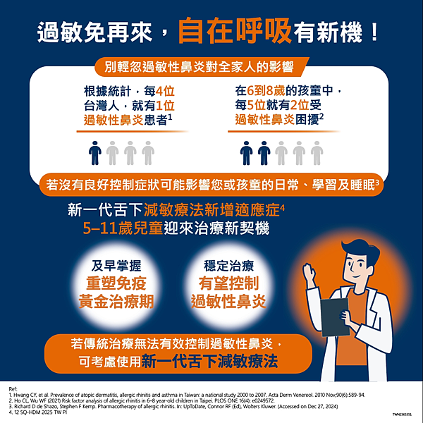 「值得一提的是,5 至 11 歲不僅是過敏性鼻炎的好發年齡,更是重塑免疫的關鍵時期。若能在此階段透過科學方式訓練免疫系統冷靜應對過敏原,將有望更有效地控制病情,甚至爭取長期控制的可能。」