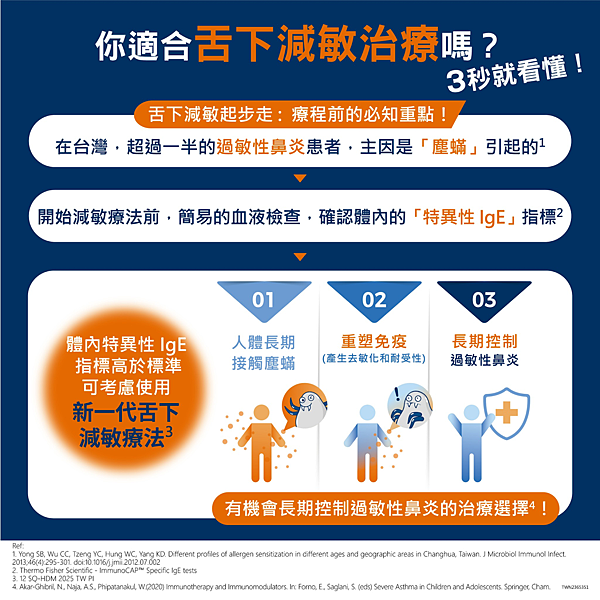 臺大醫院雲林分院小兒部王敬瑜醫師提及,新一代舌下減敏療法適應症已新增5歲至11歲的病患9,只要確認過敏原為塵螨就有機會用藥,透過每日服用一次藥物的方式,達到長期接觸少量塵螨萃取物的效果,此療法透過重塑免疫、訓練免疫系統以沉穩面對過敏原。提醒民眾,重塑免疫的過程如同馬拉松,需要長期且穩定的訓練,治療前期可能會先出現副作用。由於免疫重塑需時較長,學會目前建議至少治療1.5年,約在治療8至14週時會看見症狀減輕5;完成1.5年的治療後6,有望迎來長期控制疾病,甚至達到穩定控制的目標。