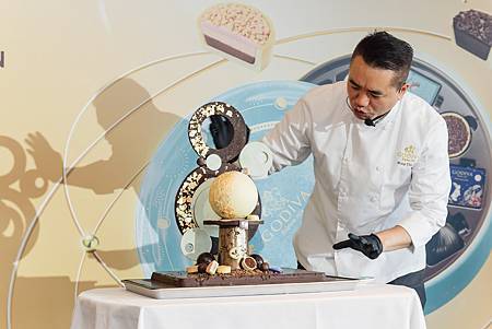 圖說:GODIVA 亞太區巧克力大師王艷炫現場創作巧克力拼接作品,並以「塔巧克力」點綴其中。