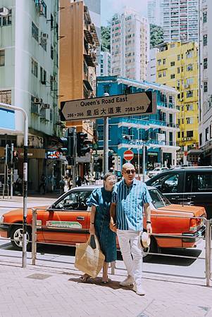第二組則由以溫暖細膩風格廣受喜愛的攝影師叮咚掌鏡,並邀請人氣樂齡KOL漂亮阿嬤鍾玉燕與其丈夫周憲柔擔任模特兒。擅長以鏡頭捕捉日常自然瞬間的叮咚,以溫柔的構圖與細膩的敘事手法,記錄這對夫妻在香港旅程中的深情互動與日常。拍攝場景橫跨多個極具代表性的香港地標,包括天星碼頭、天星小輪與中環街角,兩人或牽手相視而笑,或身著旗袍和長衫搭乘叮叮車穿梭城市街景,鏡頭下流露出歷久彌新的默契與情感。茶餐廳中細品港式特調、油麻地果欄裡的俏皮互動,在大排檔享用熱騰騰的鑊氣美食,皆在叮咚的鏡頭中轉化為充滿溫度的生活片段。其中,灣仔的藍屋與和昌大押作為香港知名的歷史建築,也成為本次拍攝的重要背景,鮮明的藍色牆面與復古的建築細節,不僅映襯出漂亮阿嬤夫妻的幸福互動,更凸顯歲月的厚度與城市的獨特記憶,使畫面在復古氛圍中更顯深意。透過叮咚的鏡頭,香港不再只是旅程的目的地,而是乘載著兩人情感與時光流轉的故事畫面,也為樂齡時尚寫下溫柔而真實的新篇章。