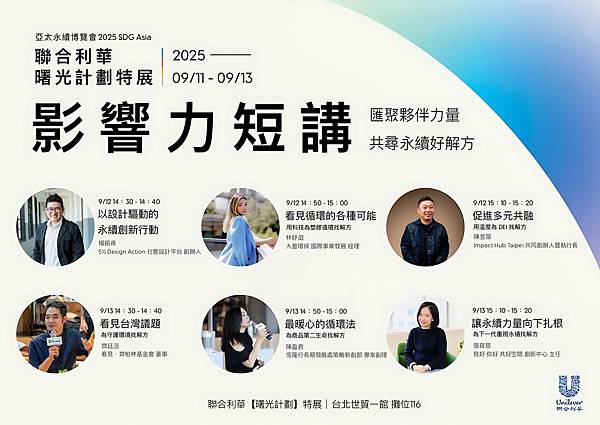 圖7_聯合利華自9 月 12日起至 9 月 13 日特別舉辦六場「永續影響力短講」,邀請六位永續夥伴透過10分鐘時間,分享不同領域的實踐經驗,帶來永續議題的「好解方」。圖/聯合利華提供
