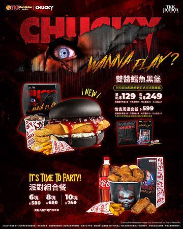 全台第一家連鎖炸雞品牌「頂呱呱」迎接萬聖節,宣布攜手全球經典恐怖IP《鬼娃恰吉CHUCKY》,主題延伸經典台詞,打造「WANNA PLAY系列」!同時頂呱呱也首次推出萬聖節主題—「TKK HORROR FEAST」,未來每年十月都將以不同暗黑創意與經典角色登場,打造粉絲心中專屬的「萬聖節吃炸雞傳統」!自10/24(五) 起,全台頂呱呱推出全新商品「雙醬鱈魚黑堡」、「德式香腸」及熱門推薦「呱呱雞排」等限定美味,搭配怪可愛的鬼娃恰吉包裝與限量必收藏的「發條玩具盲袋(共四款)」、滿額贈造型貼紙,今年萬聖節就來頂呱呱,迎接最惡趣的速食派對吧!