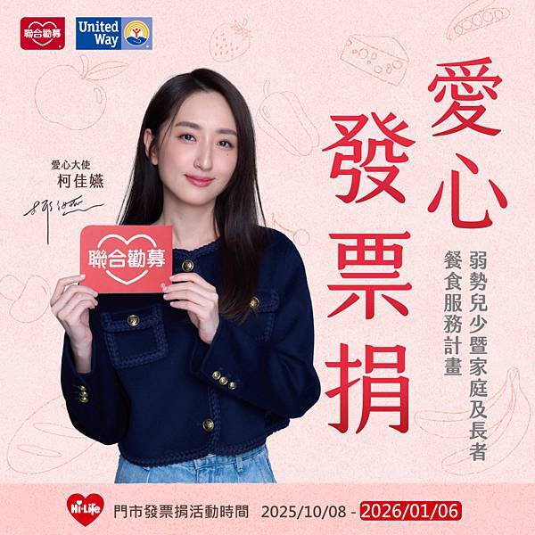 為協助弱勢家庭減輕餐食負擔,聯合勸募攜手愛心大使柯佳嬿與萊爾富,自即日起至 2026 年 1 月 6 日,共同推動「愛要即食 弱勢餐食服務計畫」。計畫將透過萊爾富門市發票捐募集資源,提供新鮮餐食與營養教育課程,改善用餐品質並提升生活技能。聯合勸募理事長鄭信真表示:「食衣住行是人類最基本的需求,其中『食』是維繫生命與健康的根本。我們發現許多弱勢家庭因照顧者收入不穩,孩子與長者的三餐常面臨不穩定的狀況。此計畫希望能提供新鮮、營養的餐食,同時傳遞均衡飲食觀念,讓受助者獲得更長遠的支持。」今年再度入圍金鐘獎戲劇節目女主角獎的愛心大使柯佳嬿也呼籲:「不要小看一張發票的力量,隨手的善意就能帶來深遠的改變。」